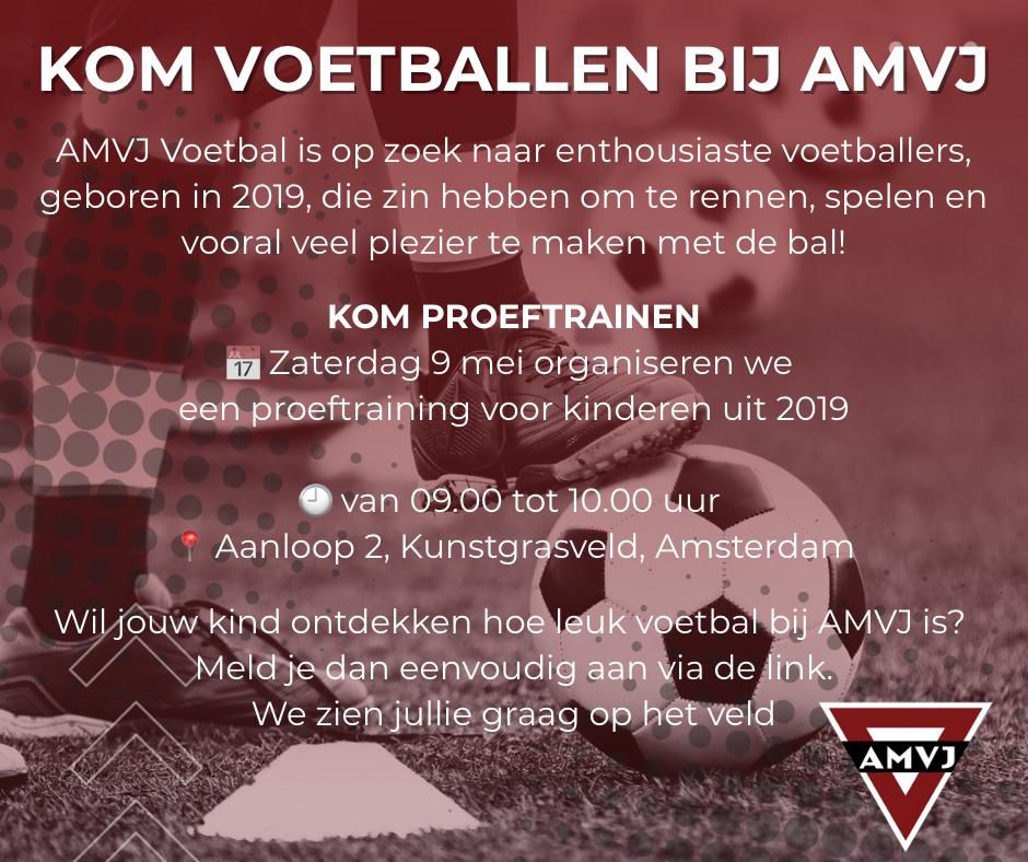 AMVJ heeft nog ruimte voor enthousiaste voetballers, geboren in 2019. Lijkt het je leuk om een keertje mee te trainen? Kom dan op 9 mei naar AMVJ.